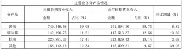 上述“三驾马车”中,报告期内酱油收入同比增长6.81%,蚝油也同比增长了3.69%,调味酱则在上半年表现不佳,同比下滑了3.6%。