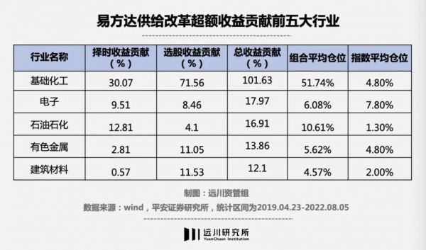根据平安证券研究所对易方达供给改革的超额收益来源进行分析,该产品合计173.7%的超额收益贡献中,选股贡献了113.4%,行业配置贡献了60.2%,其中,基础化工、建筑材料、有色金属等行业选股贡献居前,基础化工、石油石化、电子等行业配置收益贡献居前[1]。