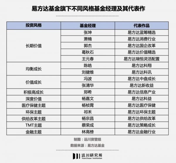 光是主动权益,易方达可以说是集齐了所有类型的基金经理——长期价值、均衡成长、价值成长、积极高成长、深度价值、主题基金,每种投资风格下都有优秀的代表人物。