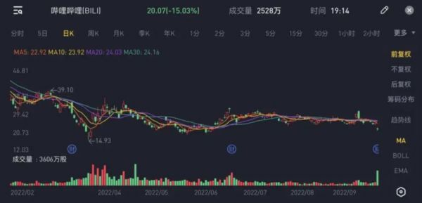 受财报不及预期影响,北京时间9月8日,B站美股盘前便大跌。至北京时间9月9日美股收盘,B站报收20.07美元/股,大跌15.03%,总市值78.39亿美元。