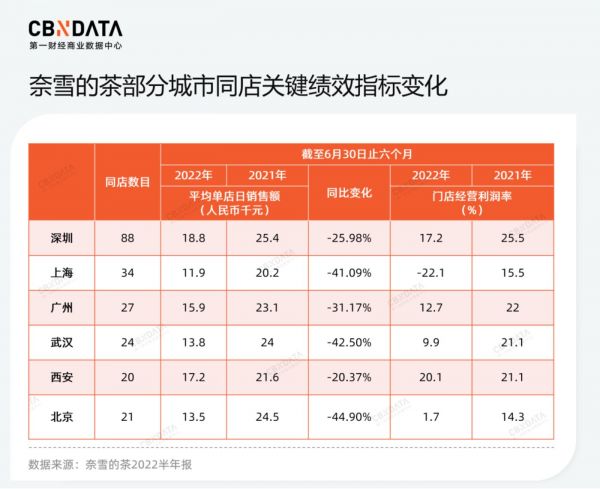 但降价对销量的拉动效果似乎不甚明显。半年报数据显示,奈雪的茶过去半年间平均单店日订单量由去年同期的488.9笔下滑为346.2笔。北上广深等主要城市的平均单店日销售额均有20%-45%的下滑;各城市门店经营利润率也有不同程度下跌,在上半年受疫情影响最为严重的上海,门店利润率甚至由正转负,大跌超37个百分点。