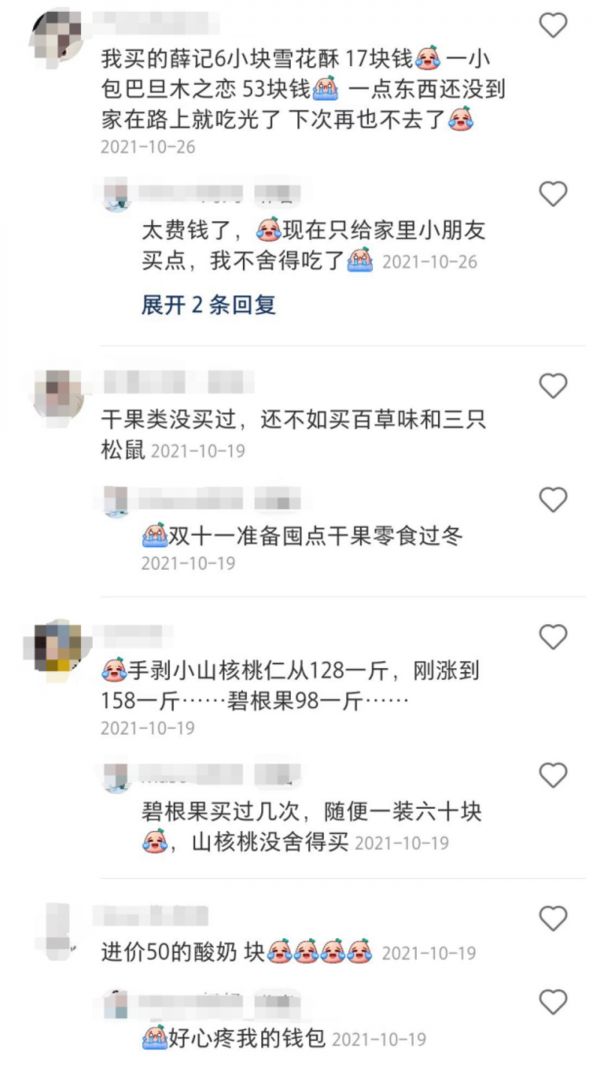 手工制作的成本压力、原料成本的上涨,外加房租水电在疫情后上涨等外在压力,零食炒货的价格不断攀升,不仅是薛记,路边不知名的烤地瓜和糖炒栗子都有一定幅度的价格上涨。但与后者的小幅提升不同,薛记的贵“不止一点点”。