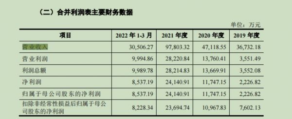 数据显示,2019-2021年以及2022年1-3月,博隆技术实现的营业收入分别为36732.18万元、47118.55万元、97803.32万元以及30506.27万元,同期内的归属净利润分别为2226.82万元、11747.15万元、24140.91万元、8537.19万元。