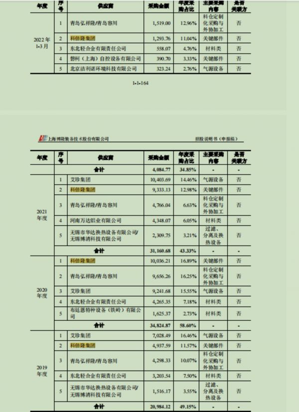 另一组数据显示,2019-2021年以及2022年1-3月,博隆技术关键部件的采购金额分别为9901.83万元、14355.62万元、17091.31万元、3071.39万元,可见科倍隆集团的重要作用。