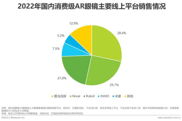 艾瑞咨询报告显示,从2022年国内消费级AR眼镜主要线上平台的销售情况来看,雷鸟、Nreal、Rokid这3家AR眼镜厂商占据74.5%的市场份额。其中,雷鸟以28.4%的份额位居行业首位。