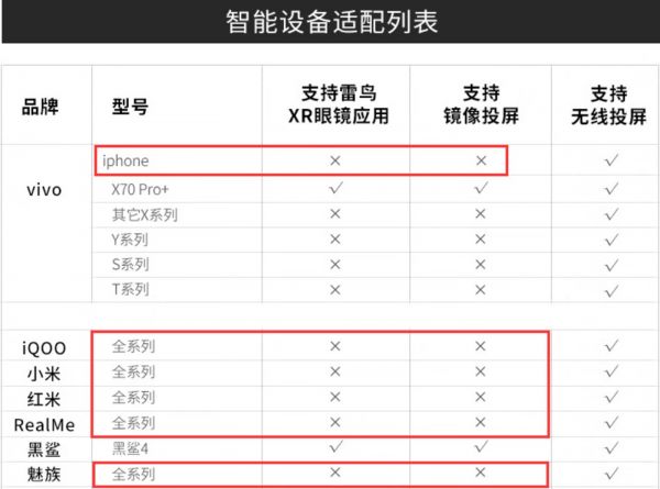 第四,雷鸟需要思考并解决“如何增强兼容性”的难题。「创业最前线」注意到,目前iPhone、小米、红米、魅族、RealMe、iQOO等全系列,均不支持雷鸟XR眼镜应用和镜像投屏功能,只支持无线投屏功能。