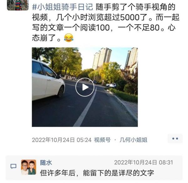 我认识一个自媒体小伙伴,卧底做了好几个月外卖骑手,写了一系列骑手日记。可她认真写的文字的浏览量却远不及偶尔发的一个没啥营养的小视频,确实会非常影响心态,好在她还是坚持了下去。(有兴趣可以看:“陌生人肖像计划”)