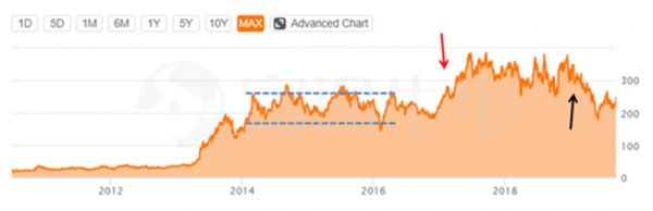 直到2018年底,特斯拉总算解决各种问题,按理说这才是Model 3释放潜力的起点,但进入19年股价却重新跌回150-260区间。为什么?