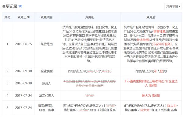 公开资料显示,菲诺克成立以来有过三次法人变更记录,最后一次是2018年,将自然人法人变为公司法人——菲诺克生物科技(上海)有限公司,2019年6月,经营范围增加了“销售牲畜”、“技术检测”等项目。公开渠道显示的招聘信息,也多为动物饲养员、实验动物技术员等动物相关岗位。能看出该公司的经营范围增加了人源化小鼠等实验动物模型的相关方向。
