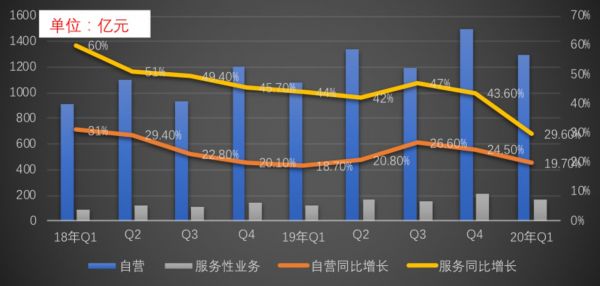 值得注意的是,2020年Q1,服务性收入下降明显,同期自营业务则有所抬头,较上年同期同比甚至有明显的上扬。