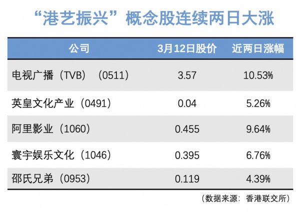 这场事先张扬的攒局,甚至拉动“港艺振兴”概念股多日出现异动——3 月 11 日~12 日,TVB、英皇、阿里影业、寰宇、邵氏兄弟等概念股持续飘红;其中,TVB 在 12 日上涨超 9%,阿里影业上涨 9.64%,英皇文化上涨 5.26%,寰宇娱乐上涨 6.76%,邵氏兄弟上涨 4.39%。