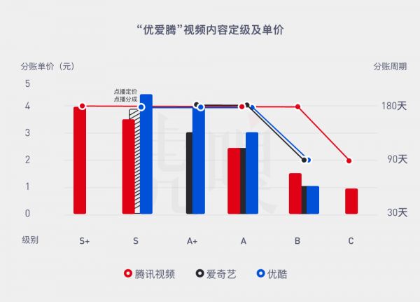 其次,利益捆绑更紧了。以优爱腾为例,三家会将项目(更多是网剧、网络电影)大致分为 S+、S、A+、A、B、C 级,对应匹配的流量、资源完全不同,例如平台重点推荐的 S 级项目几乎会包圆全线平台产品营销资源。