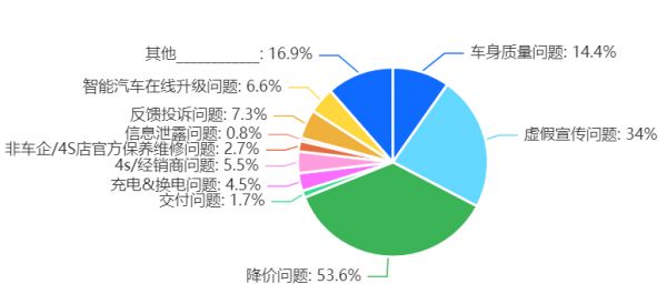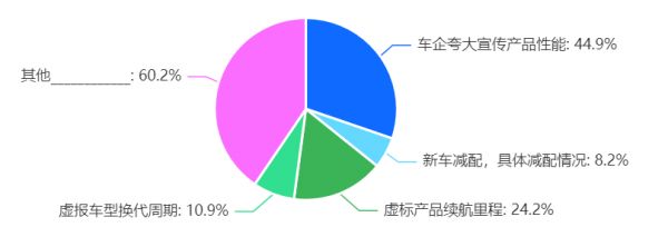 虚假宣传一直是消费领域的热点问题。在调研中,反映虚假宣传问题的车主有256位,占比为34%,仅次于降价问题。在虚假宣传问题中,“车企夸大宣传产品性能”、“虚标产品续航里程”和“虚报车型换代周期”是最受诟病的三种行为,占比分别为44.9%、24.2%、10.9%。