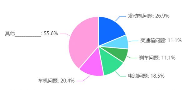 从燃油时代到新能源时代转型过程中,汽车消费者也开始迎来一些新的质量问题。根据调研结果,共有108位车主遭遇到了质量问题,其中排在首位的是老生常谈的发动机问题,发动机不仅传统燃油车有,插电混动车上也有,反映了发动机问题的车主共有29位,占比为26.9%。