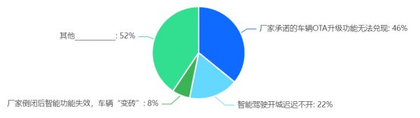 在调研中,共有50位受访车主反映其智能汽车遭遇到了问题。其中,“厂家承诺的车辆OTA升级功能无法兑现”涉及23位车主,占比46%;“智能驾驶开城迟迟不开”涉及11位车主,占比22%;“厂家倒闭后智能功能失效,车辆‘变砖’”涉及4位车主,占比8%。
