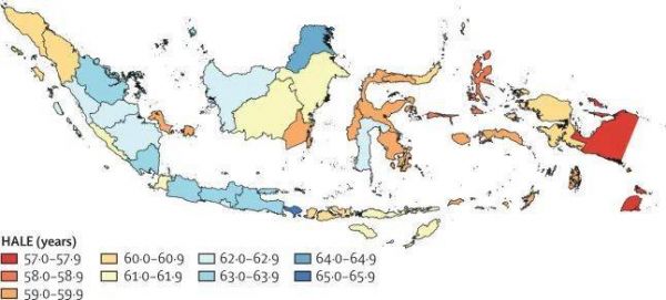 图5:印尼各省份地区健康预期寿命(HALE);图片来源:《柳叶刀》杂志