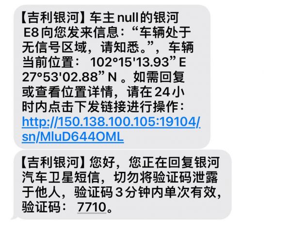 如图所示,当车辆端发送一条“报平安”短信后,手机端就能收获一条包含车辆精确位置的信息。通过点击短信内的链接,用户还可以对车主回信,或查看精准位置。