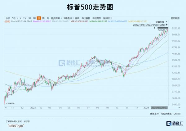 隔夜,美股市场再创历史新高。其中,道琼斯和纳斯达克指数均大涨逾1%。标普500上涨0.89%,收盘突破5200点,较去年11月初大涨逾27%。