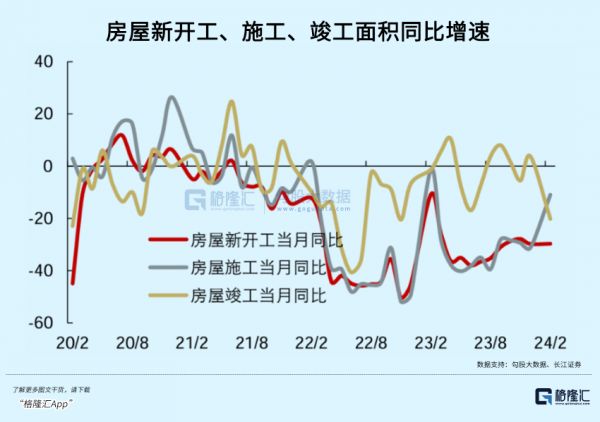 不过,房地产市场依然承压。1~2月地产开发投资同比增速回升至-9%,但开工、施工、竣工同比增速均在回落。这已经是连续3年近10%的负增长,成为固定投资最大拖累项。另外,1~2月商品房销售面积同比下滑20.5%,销售额同比下滑29.3%。