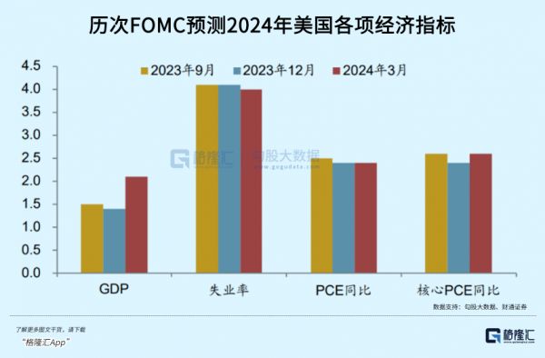 关于失业率,2024年预期中值4%,较12月下修0.1%。关于通胀,2024年的PCE、核心PCE分别由12月的2.4%、2.4%分别上修0%、0.2%。关于经济,预期2024年GDP中值为2.1%,较12月上修0.7%。