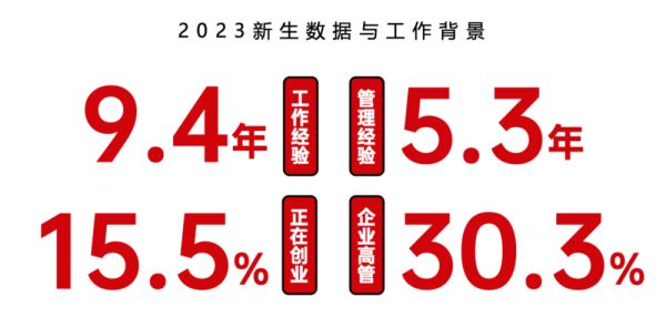 根据交大安泰MBA官网的公开资料显示,以往MBA新生的平均工作经验9.4年,平均管理经验5.3年;其中15.5%的新生处于正在创业阶段,30.3%担任企业高管。