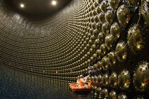 说它准吧,有道理。看起来,这个四面布满“眼睛”的装置,原型类似日本的“超级神冈”中微子探测装置。这个装置里面本来应该装满了超纯水,如果有中微子穿过超纯水,会发出微弱的闪光,并被数十万只“眼睛”——也就是光电倍增管——捕捉到。