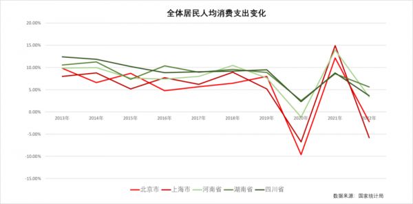 其实,除了在媒体上占据更多声量一线城市以外,在中国看消费,中南、西南地区的“烟火气”也十分值得关注。参考北京、上海、河南、湖南、四川5个省市的全体居民人均消费支出变化,可以看到虽然大趋势趋同,但是总体而言,一线以外的河南、湖南、四川人均消费支出总体增长较快且波动相对平缓——无论发生什么,这些区域依然对于消费有着更强的诉求与渴望。