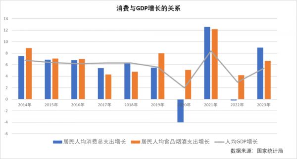 根据国家统计局数据,在过去10年中,大部分时间居民人均食品烟酒支出增速都与GDP增速紧密相关,而自2020年起充满波动的四年中,食饮消费对经济增长的贡献则是不言而喻地重要。