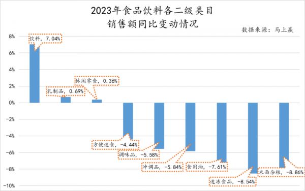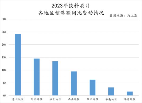 以饮料为例,根据马上赢数据,2023年销售额同比增长较明显的区域是东北地区、西北地区、华北地区,而传统印象中饮料零售更发达、天气炎热人均消费量更高的华南、华东,反而在饮料销售额同比增长上没那么高。