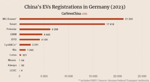 德国联邦交通局2023年中国品牌新能源汽车注册数据显示,在排除特斯拉后,中国新能源汽车在德累计新注册量为5.77万辆,但其中名爵、Smart和极星就贡献了超过4.4万辆,这些车型准确来说属于“合资品牌”。再将这些“合资品牌”排除后,纯中国汽车品牌销量仅为1.27万辆,对应的市占率约2.4%。