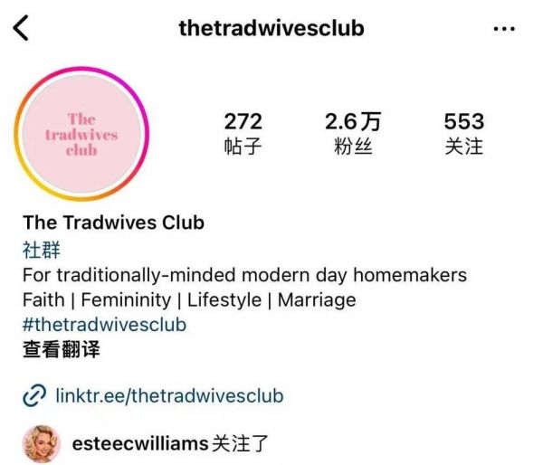 知名的Tradwife账号@The tradwives club(传统妻子俱乐部)在Instagram的简介是:“生活在当下的世界里,但有着传统思想的家庭主妇们。”