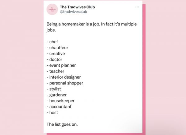 账号@The tradwives club在发帖中写道:“家庭主妇是一份工作,实际上,它是一份终极工作。它包含了:厨师、司机、创意师、医生、活动策划、老师、室内设计师、私人采购师、造型师、园丁、管家、会计、组织者……这样的例子数不胜数。”