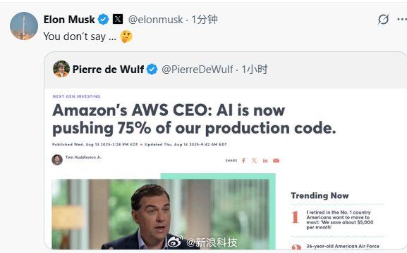 马斯克转发亚马逊AI生成75%代码文章
