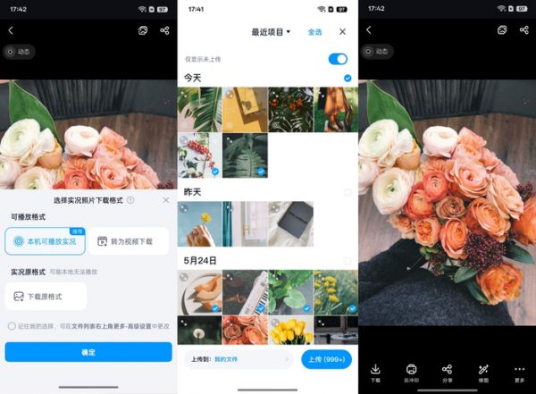 现在安卓用户把实况图上传到网盘,不仅可以直接在网盘里观看动态画面,而且当把图片下载回相册时,依然能完整呈现最初的实况效果,画质不会有任何损失。跨系统分享动态照片变得前所未有的方便。