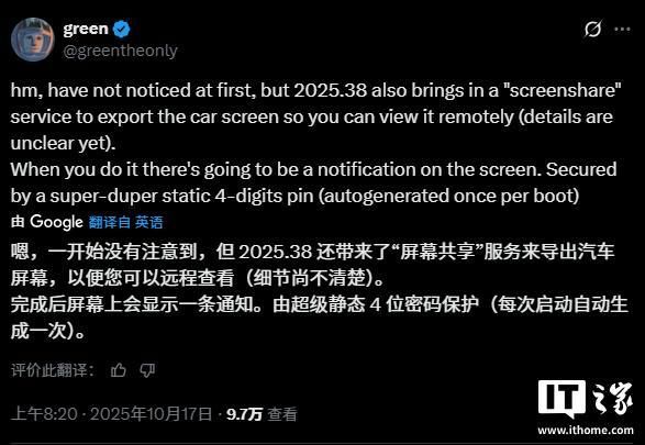 IT之家注意到,特斯拉技术分析师 green 在近期对代码进行深入分析时发现,该公司正计划通过 2025.38 版软件更新引入“屏幕共享”(screenshare)功能。目前关于该功能具体应用场景的信息尚不多,但据他透露,这一功能将允许车辆屏幕内容被导出,从而实现远程查看。