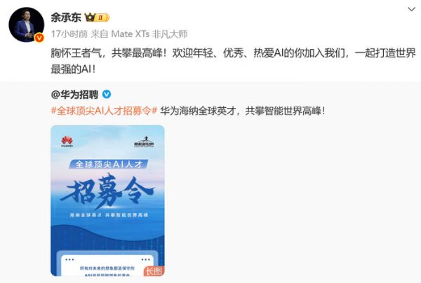 10 月 21 日消息,华为招聘发出全球顶尖 AI 人才招募令的同时,华为常务董事余承东亲自转发,直呼欢迎全球年轻、优秀、热爱的 AI 人才加入他们,共同打造世界最强 AI。