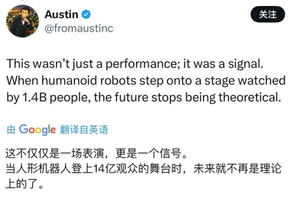 “这不仅仅是一场表演,更是一个信号。当人形机器人登上14亿观众的舞台时,未来就不再是理论上的了。”