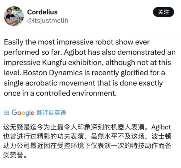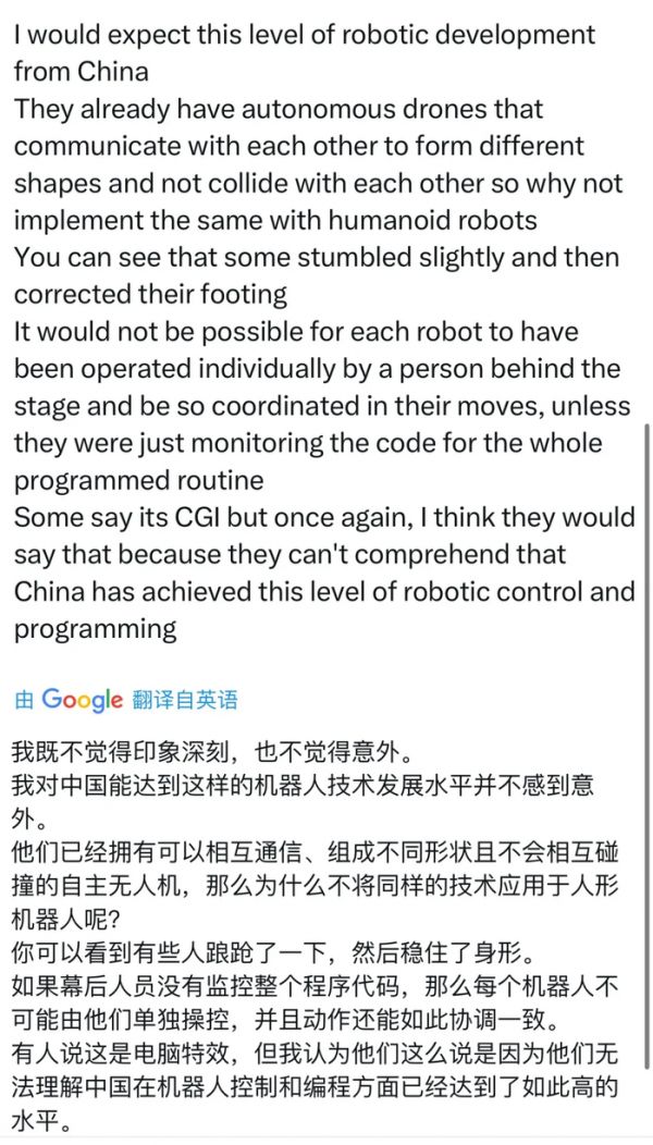 “我既不觉得印象深刻,也不觉得意外。我对中国能达到这样的机器人技术发展水平并不感到意外。他们已经拥有可以相互通信、组成不同形状且不会相互碰撞的自主无人机,那么为什么不将同样的技术应用于人形机器人呢?”