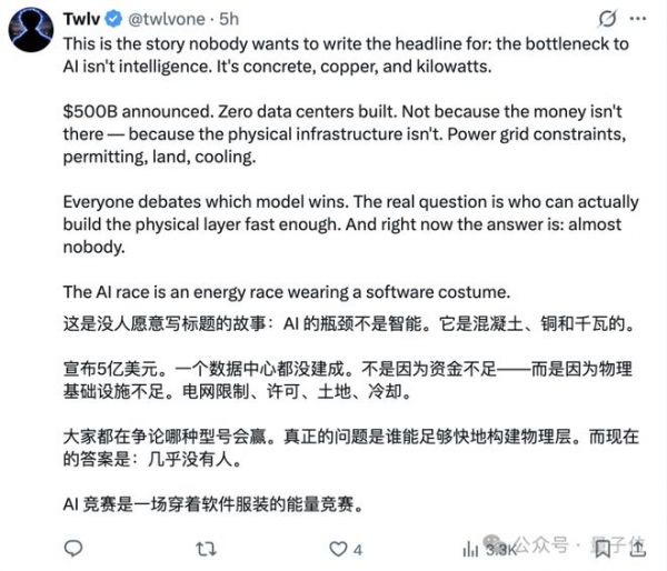 不过,也有网友指出,OpenAI并不是因为缺钱才干不成,主要因素还是电网、许可、土地等结构性问题。