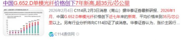 据上海证券报2月6日报道,2026年1月国内G.652.D单模光纤均价突破35元/芯公里,部分报价突破40元/芯公里,创近七年新高,年内涨幅超80%。