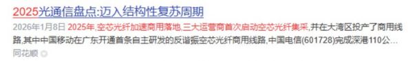 不过,2025年,空芯光纤加速商用落地,三大运营商首次启动空芯光纤集采。中国移动在广东开通首条自主研发的反谐振空芯光纤商用线路,中国电信完成深港110公里跨境系统部署,中国联通实现深港数据中心空芯光纤互联,加速空芯光纤从实验室走向现网商用实验。