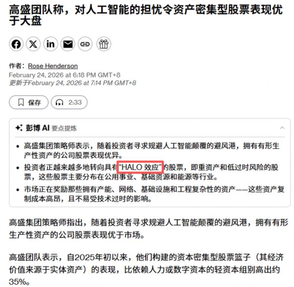 英伟达的调整,国产算力的崛起,背后是全球AI产业的底层逻辑重构,而高盛最新提出的“halo效应”——即人工智能时代的重资产(Heavy Assets)、低淘汰率(Low Obsolescence),恰好精准解释了当前AI产业链的投资逻辑。