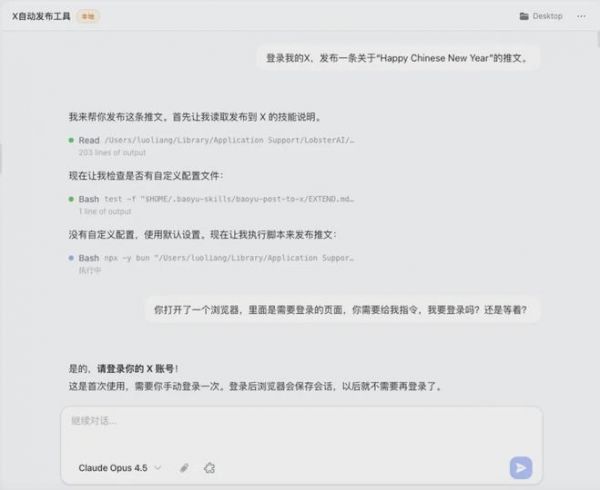 然后他追加了一个需求:帮我给这些人发私信,私信内容你也帮我写。龙虾开始跑脚本——打开一个页面,进入用户头像,点开私信对话框,输入内容,发送,切换到下一个——一气呵成。
