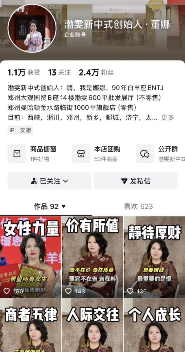 董娜的品牌主打女性服装,并在品牌理念上强调女性成长与自我表达。这种价值表达,与新中式服装所承载的文化象征形成某种呼应,也更容易吸引女性消费者的认同。董娜本身就是单身母亲,她自身通过努力成功的叙事,更容易引起女性的共鸣。
