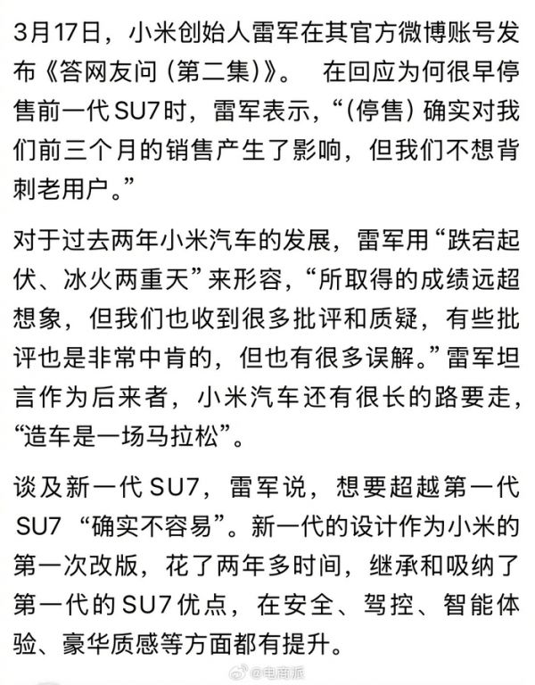 雷军回应小米质疑宣布2026年55万辆交付目标