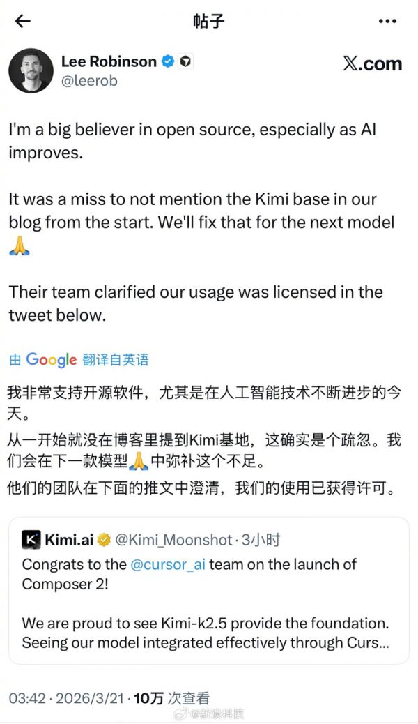 【#Cursor承认使用kimi基座#:一开始没提,确实是个疏忽】近日,Composer2疑似套用kimi-k2.5模型一事持续发酵,引发包括马斯克在内的广泛热议。kimi发文回应,首先祝贺@cursor ai团队成功发布Composer 2,并表示很自豪地看到 Kimi-k2.5 奠定了基础,称“这正是我们乐于支持的开放模型生态系统”。随后,#Cursor副总裁向kimi道歉#,知名前端开发者、Cursor开发者体验副总裁Lee Robinson发文称:“我非常支持开源软件,尤其是在人工智能技术不断进步的今天。从一开始就没在博客里提到Kimi基地,这确实是个疏忽。我们会在下一款模型中弥补这个不足。”