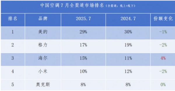 与此同时,竞争对手也在步步紧逼。奥维云网数据显示,在2025年7月中国空调全渠道市场份额市场排名中,美的以29%的市场份额继续领跑,保持其自2024年首次超越格力成为 “一哥”后的领先优势;格力位列第二,份额从去年同期的19%下滑至 17%;海尔则以15%的份额占据第三位,较去年同期提升了4个百分点。