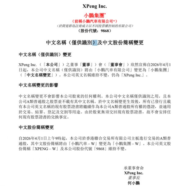 自2026年4月1日上午9时起,公司于香港联合交易所有限公司主板进行交易的A类普通股,其中文股份简称将由“小鹏汽车–W”变更为“小鹏集团–W”。公司英文股份简称“XPENG–W”及公司股份代号“9868”维持不变。