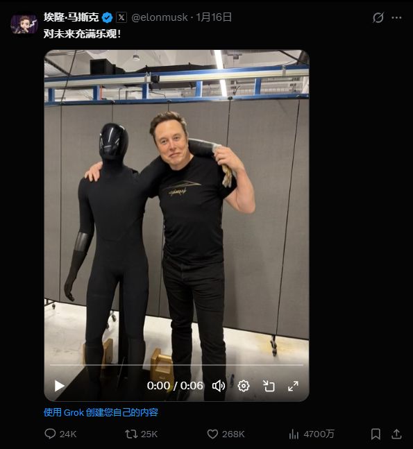 值得注意的是,早在今年 1 月 16 日,马斯克还在 X 平台上分享过用 Grok 生成的自己与 Optimus 短片,并称:对未来充满乐观!