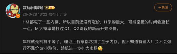 据博主@数码闲聊站 爆料,HM都囤了一些内存,所以都没有涨价,这里的HM基本指的就是华为和小米了,总不可能是HTC和meizu吧。